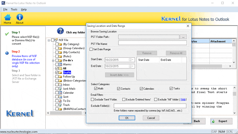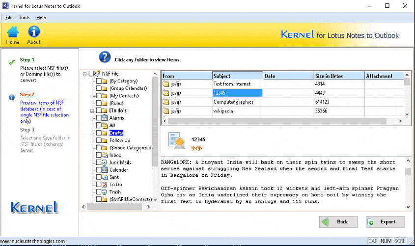 Kernel Lotus Notes to Outlook is an expedient tool to convert Lotus Notes NSF files to Outlook PST. NSF to PST Conversion software converts entire Lotus Notes Domino Server user mailboxes to PST files that can later be accessed via Exchange Server and MS Outlook. The NSF to PST converter tool migrates entire Lotus Notes mailbox data that includes emails, email attachments, address Books, Journals, Calendar etc. Kernel NSF to PST conversion recreates same folder structure of NSF file to PST file, which becomes easy to view in MS Outlook.