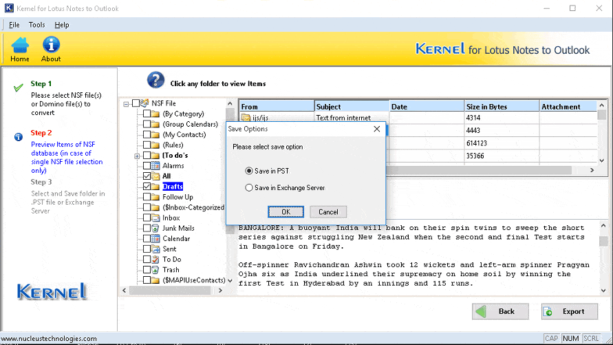 Using a trial version of the software before its purchase is very helpful. It lets you to analyze the performance of the software and if you get satisfied then you can opt to purchase the software. The free trial version of Kernel Lotus Notes to Outlook software enables you to save 10 emails from each folder of NSF and you can perform conversion of NSF file into PST format but only one at a time (restriction of demo version).