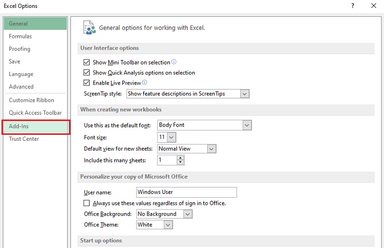 Step 3: Under the Options tab, select the ‘Add-ins’ option on the left pane.