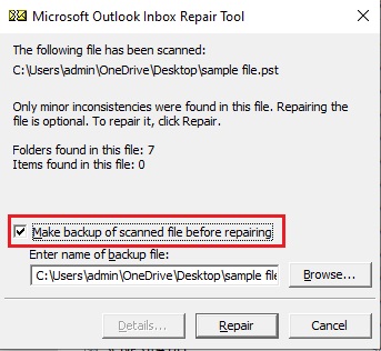 - Make sure to check the box, “Make backup of the scanned file before repairing.”