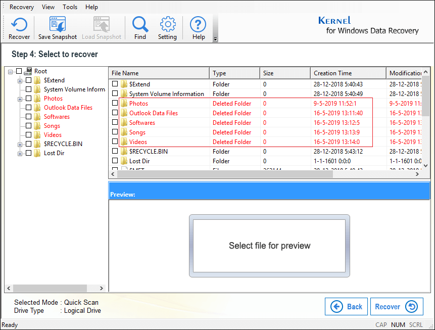 Note: File(s)/folder(s) lost or deleted permanently will be available in red color.