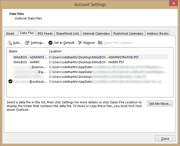 - Select the recently-created Outlook data file, from “Data Files” tab and click “Set as Default” button and again click “Close” button to implement the changes.