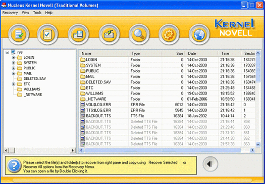 The Novell recovery software tool scans the complete damaged hard drive and lists all the recoverable files and folders which can be easily selected and copied to a working disk or volume. Recovery for Novell software recovers data from the corrupt volume(s) of a crashed Novell Server. It recovers and allows you to save your data to another drive after the cases of missing volumes, deletion of files, corrupt volume(s), allocation errors and Novell partition loss.